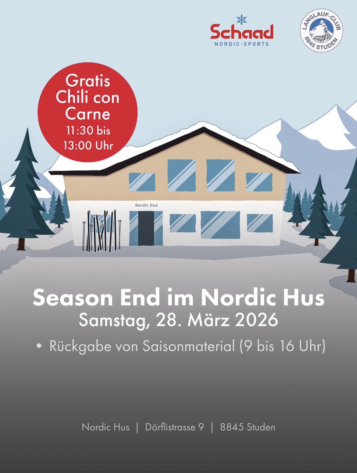 Nun ist es soweit und wir verabschieden uns für einige Zeit. Im Namen des Vorstands und dem ganzen Team bedanke ich mich herzlich für die Besuche im Langlaufzentrum Studen, Eure Unterstützung und Treue und meinem "Fanclub" :) Leider spielte der Winter nicht ganz so mit wie wir es alle gerne wollten und der Langlaufbetrieb musste wegen den frühlingshaften Temperaturen leider etwas abrupt beendet werden. Vielleicht sehe ich einige von Euch noch persönlich an unserem Season End bei einem feinen Chili con Carne. Inserat siehe unten.
